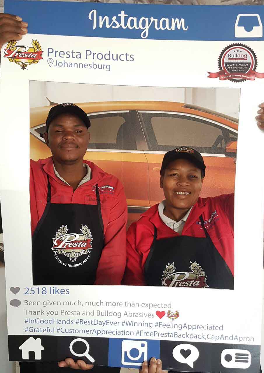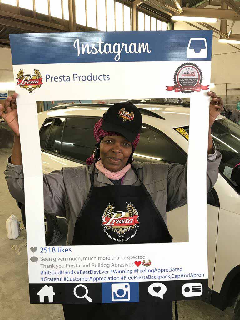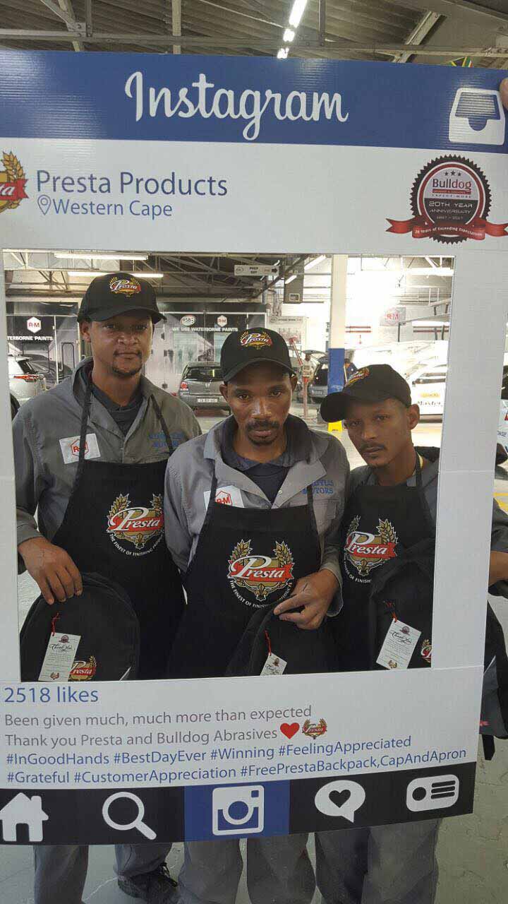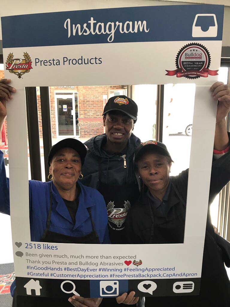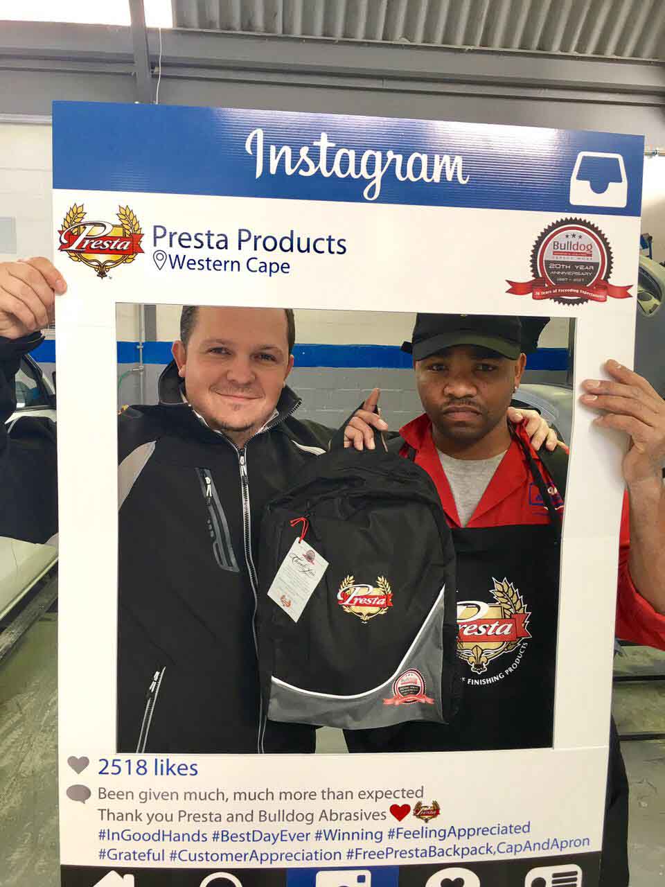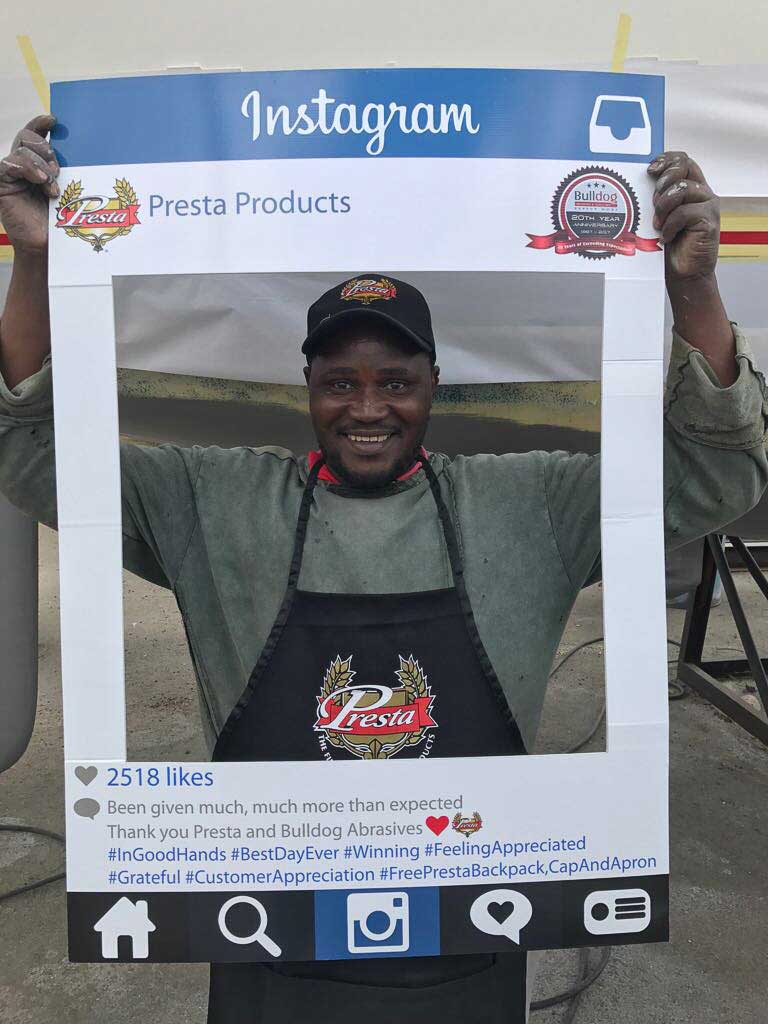 To celebrate the “20-year partnership” between the two companies – Bulldog Abrasives and Presta Products implemented an initiative where Bulldog’s top sales and technical representatives took to the road to personally say “Thank you” to each panel shop who proudly chooses to use Presta Products in their daily polishing processes. They also gave away much appreciated back-packs, caps and aprons to the hard-working polishers who actually use the product in the shops.