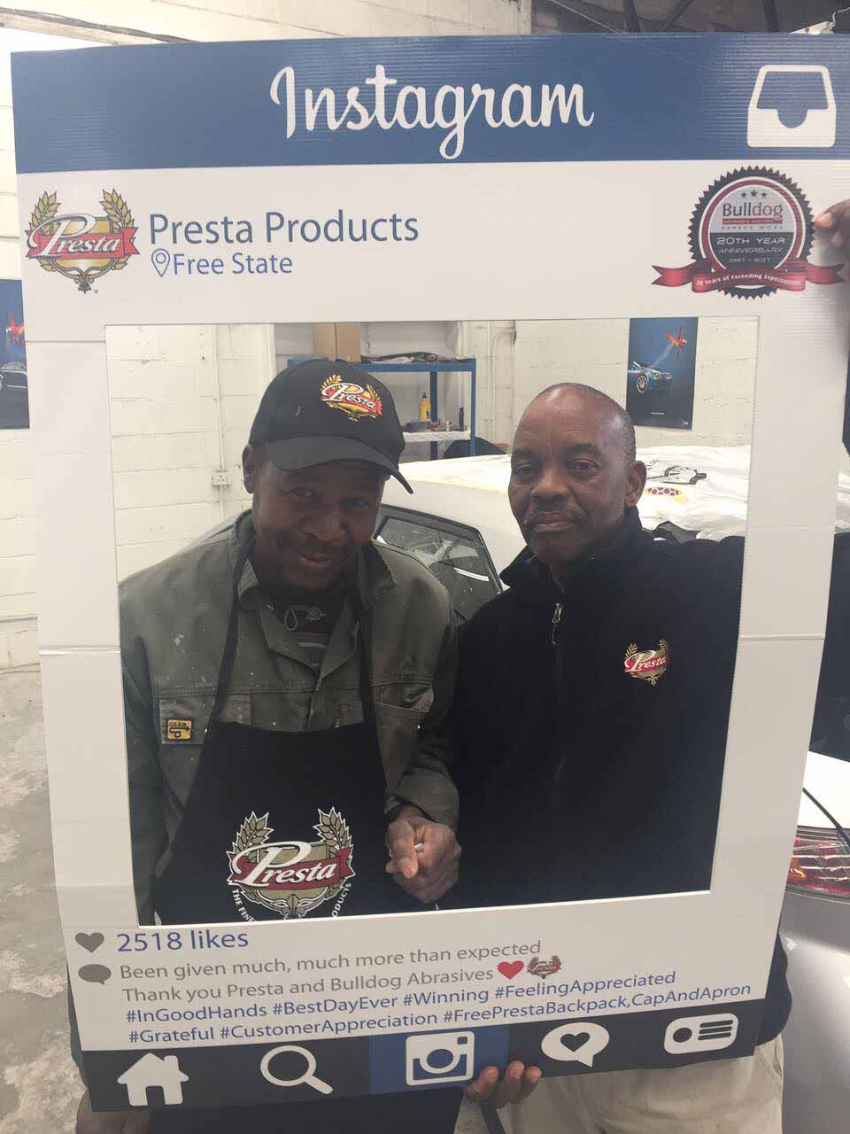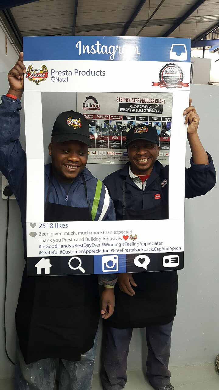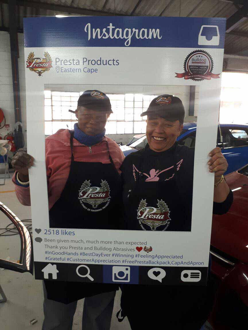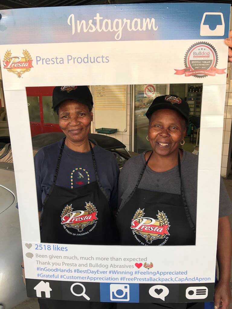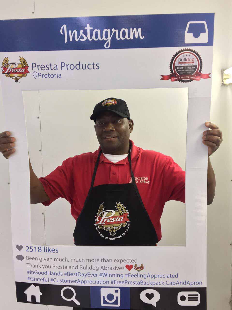 To celebrate the “20-year partnership” between the two companies – Bulldog Abrasives and Presta Products implemented an initiative where Bulldog’s top sales and technical representatives took to the road to personally say “Thank you” to each panel shop who proudly chooses to use Presta Products in their daily polishing processes. They also gave away much appreciated back-packs, caps and aprons to the hard-working polishers who actually use the product in the shops.
