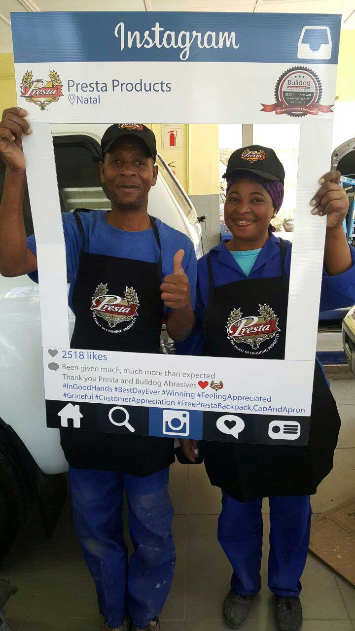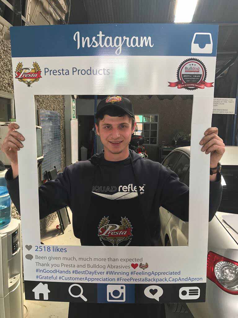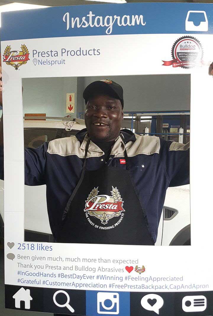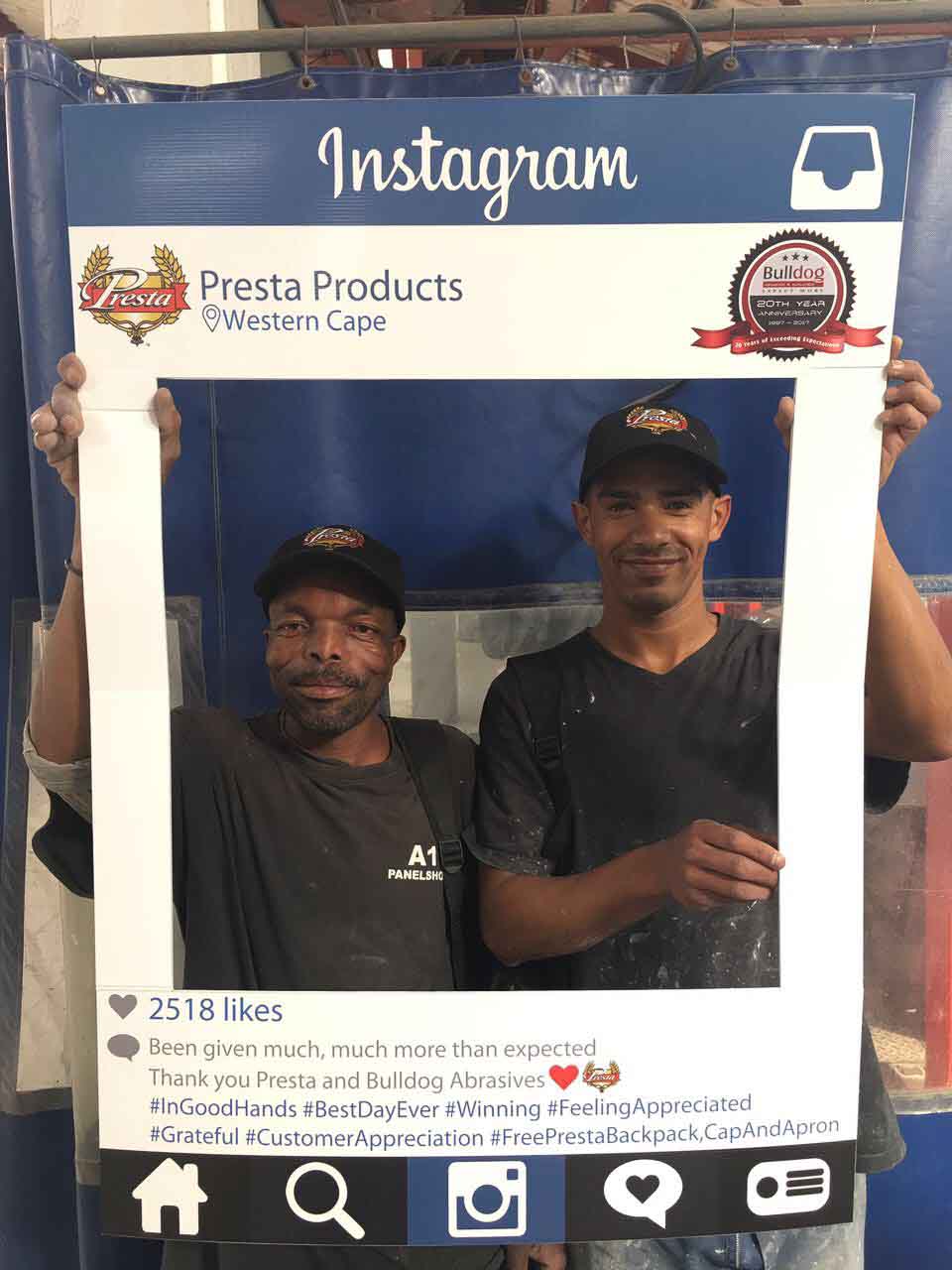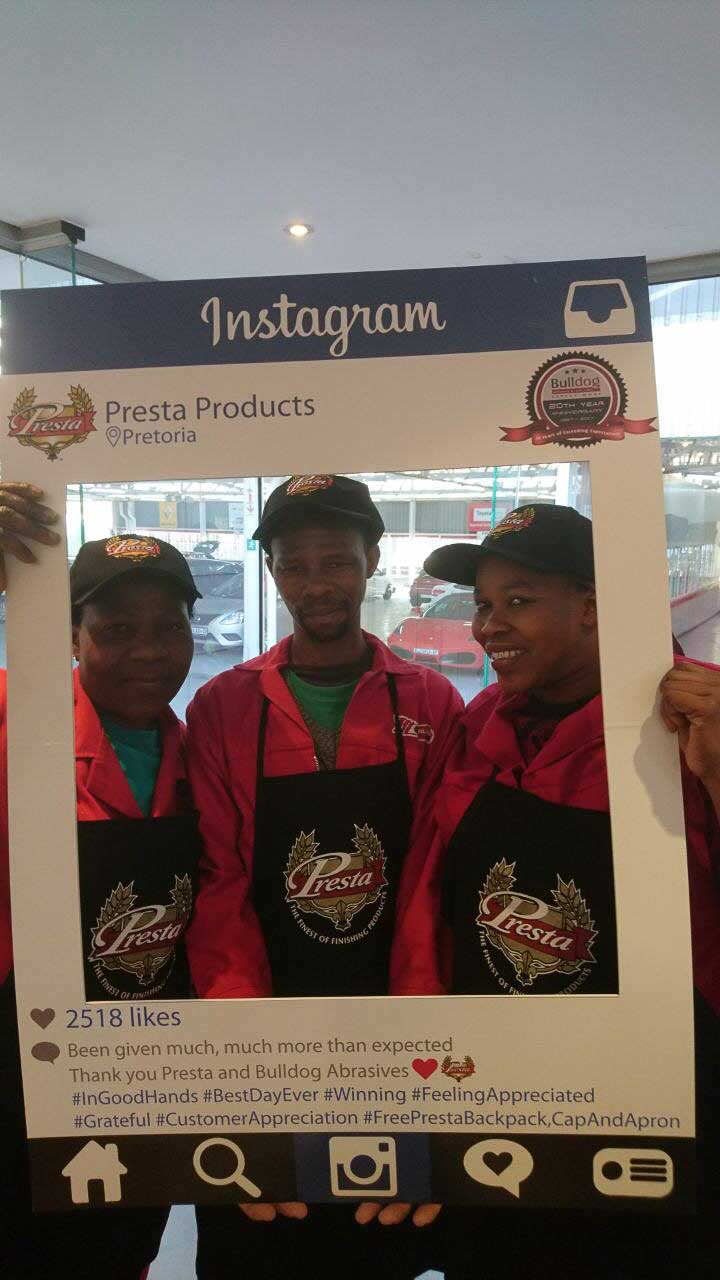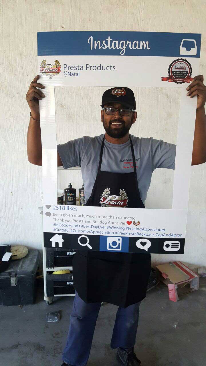 To celebrate the “20-year partnership” between the two companies – Bulldog Abrasives and Presta Products implemented an initiative where Bulldog’s top sales and technical representatives took to the road to personally say “Thank you” to each panel shop who proudly chooses to use Presta Products in their daily polishing processes. They also gave away much appreciated back-packs, caps and aprons to the hard-working polishers who actually use the product in the shops.
