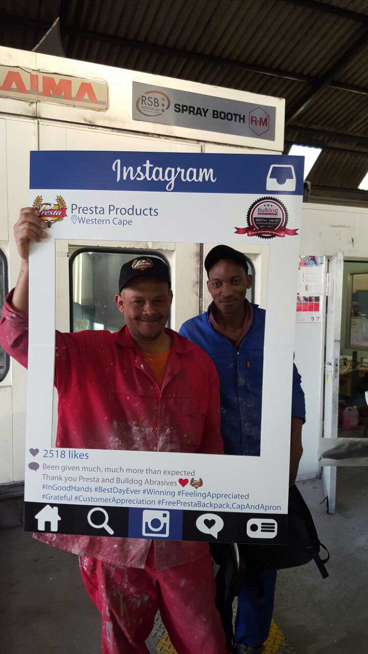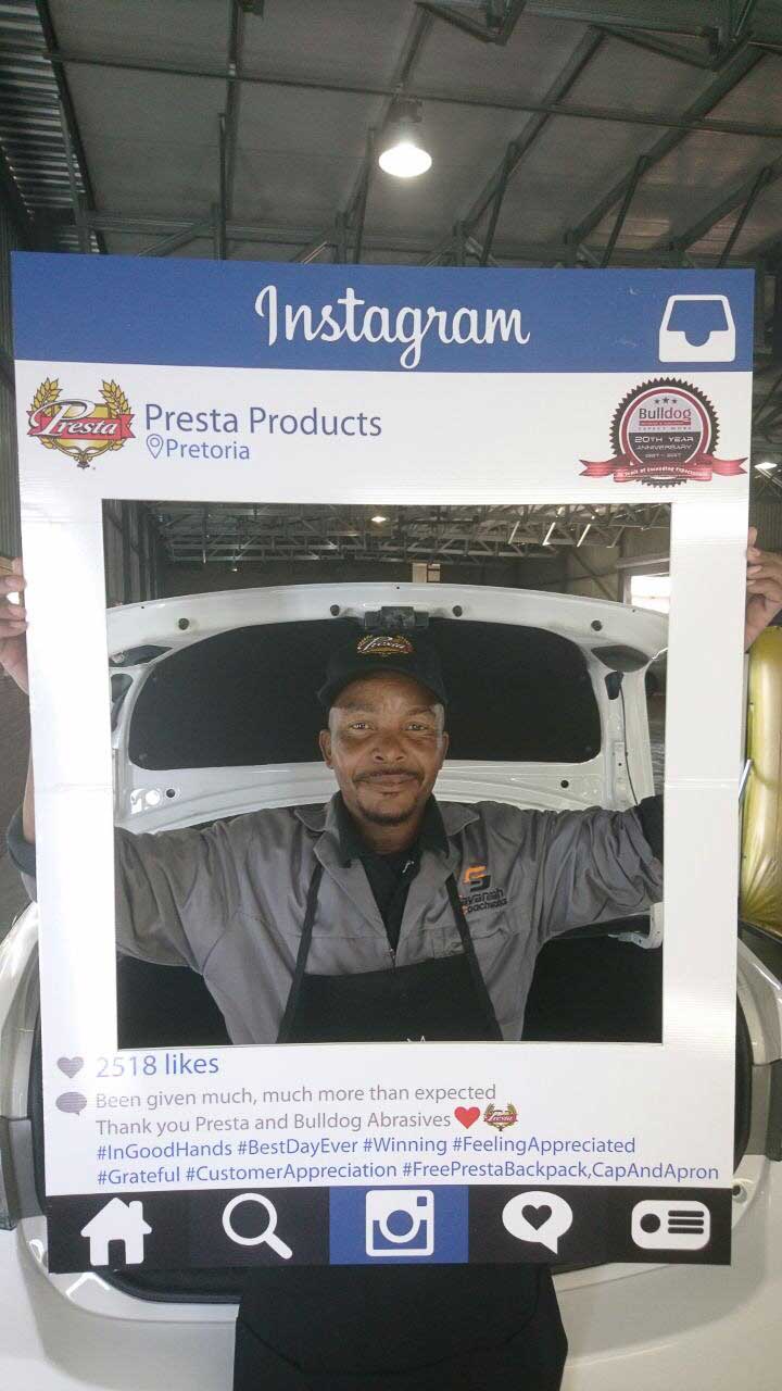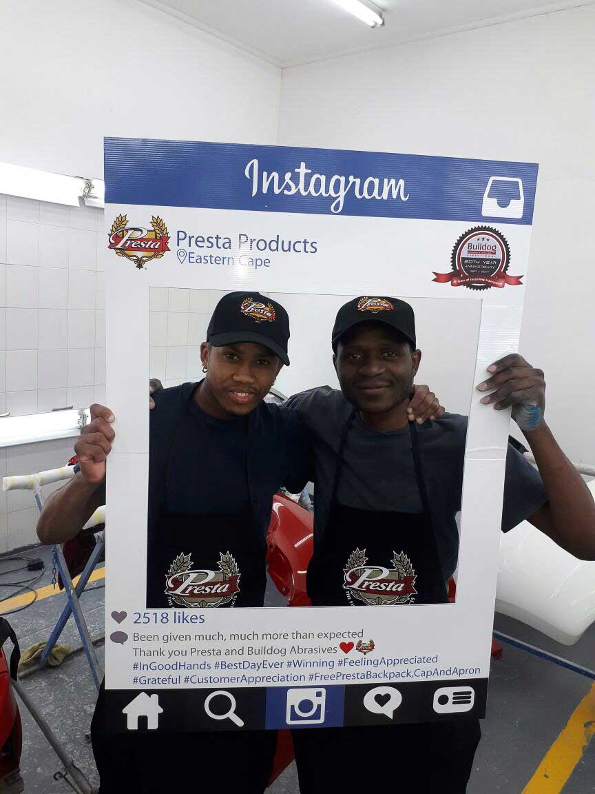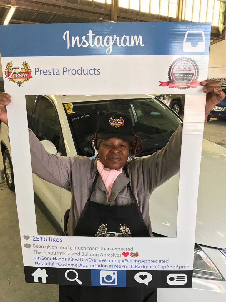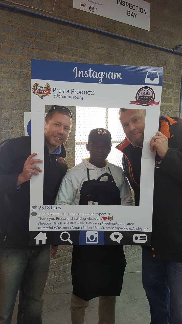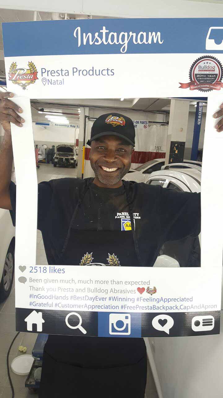 To celebrate the “20-year partnership” between the two companies – Bulldog Abrasives and Presta Products implemented an initiative where Bulldog’s top sales and technical representatives took to the road to personally say “Thank you” to each panel shop who proudly chooses to use Presta Products in their daily polishing processes. They also gave away much appreciated back-packs, caps and aprons to the hard-working polishers who actually use the product in the shops.