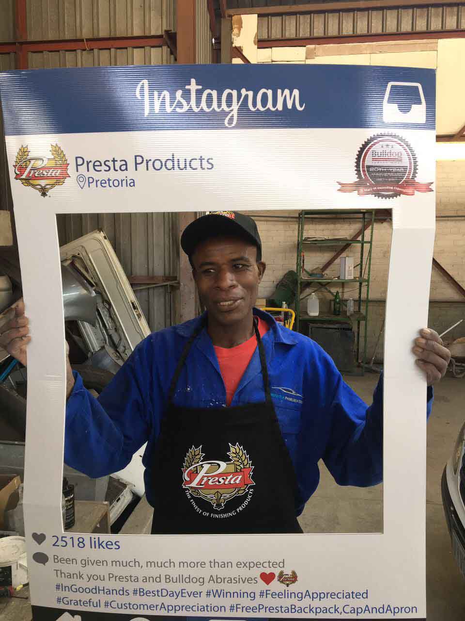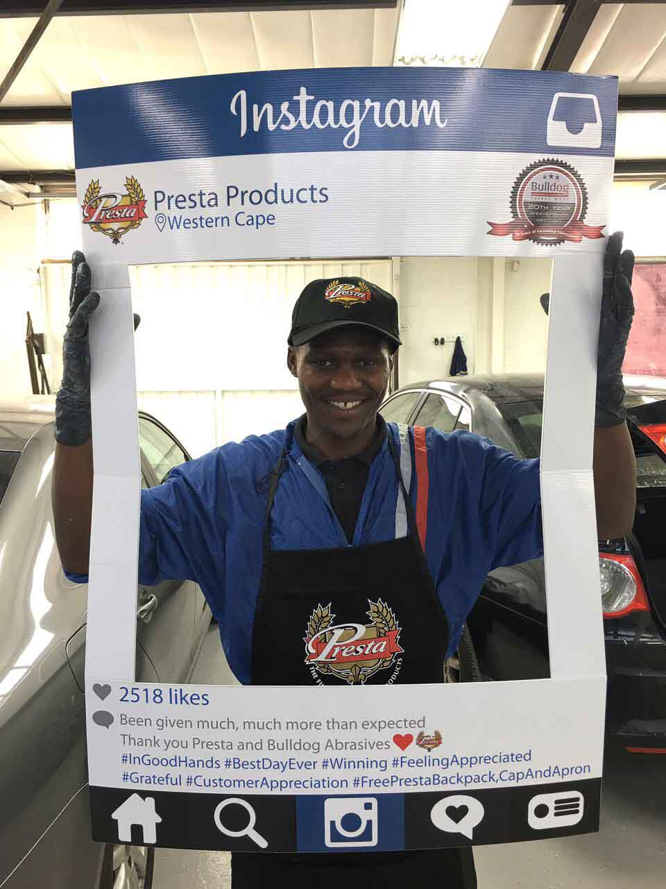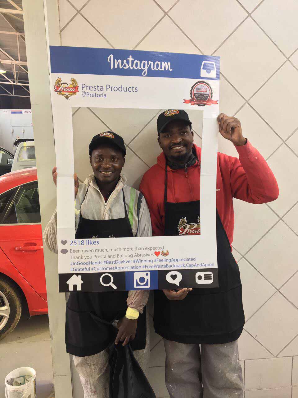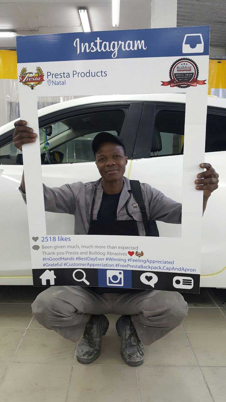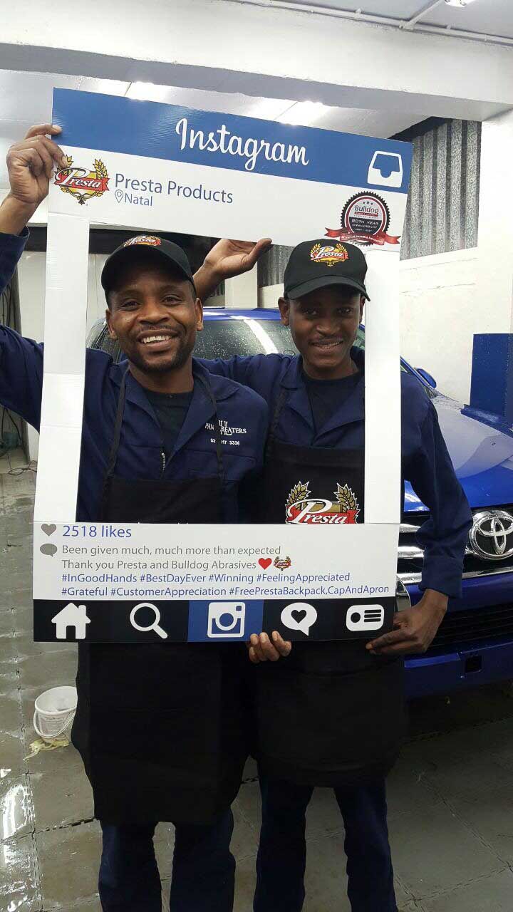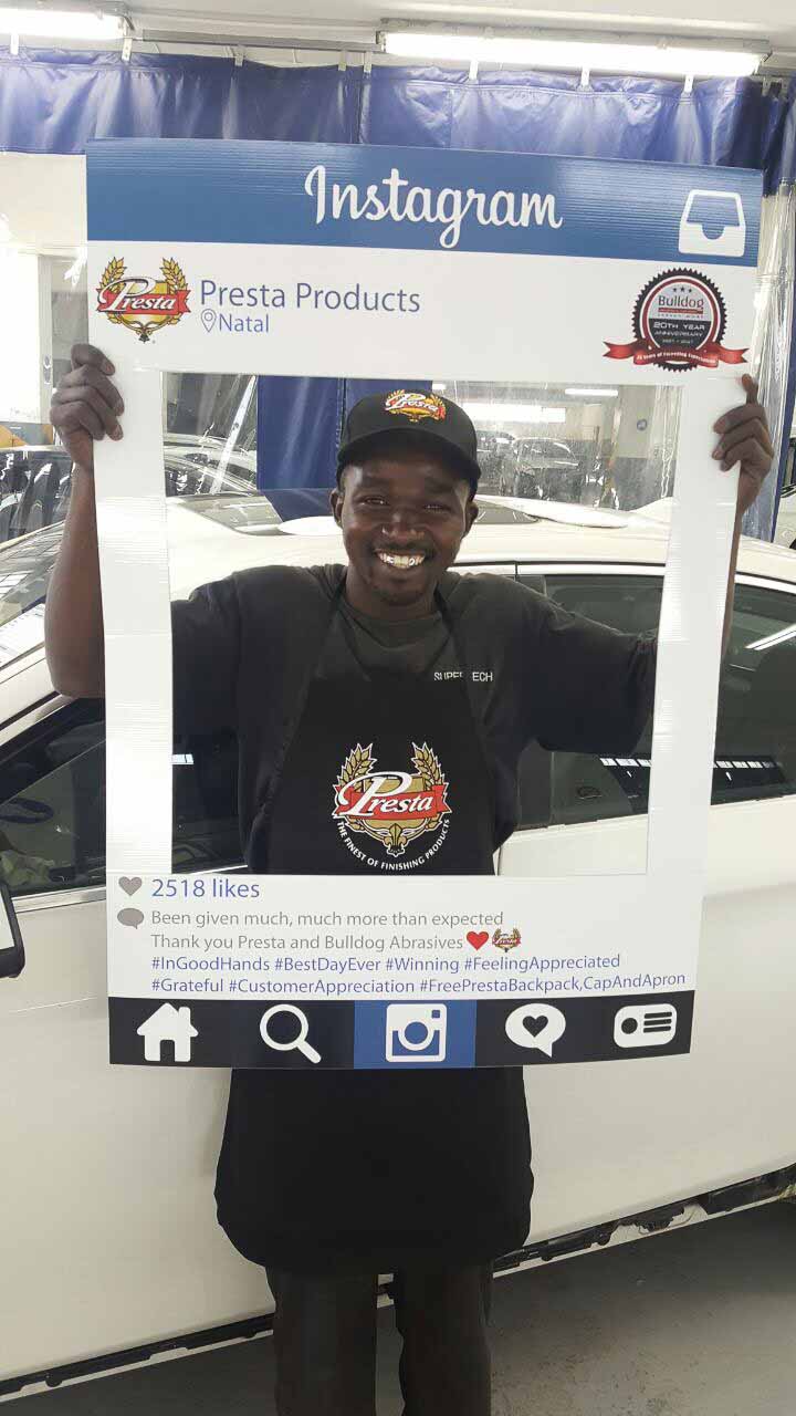 To celebrate the “20-year partnership” between the two companies – Bulldog Abrasives and Presta Products implemented an initiative where Bulldog’s top sales and technical representatives took to the road to personally say “Thank you” to each panel shop who proudly chooses to use Presta Products in their daily polishing processes. They also gave away much appreciated back-packs, caps and aprons to the hard-working polishers who actually use the product in the shops.